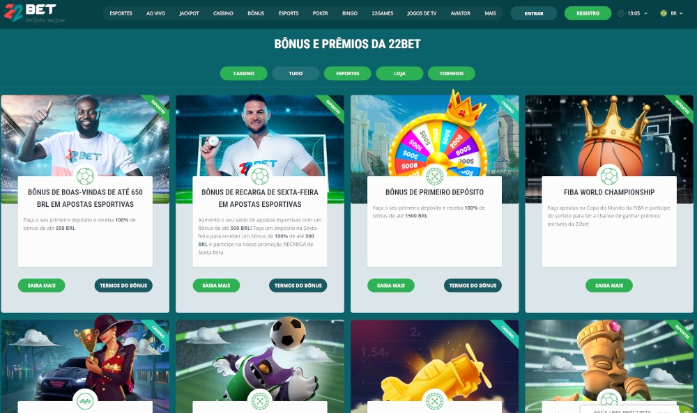 A 22bet é um grande sucesso em certos países, como é o caso de Portugal, onde a variedade de jogos oferecidos e as elevadas odds fazem dela uma casa de apostas bem atrativa.