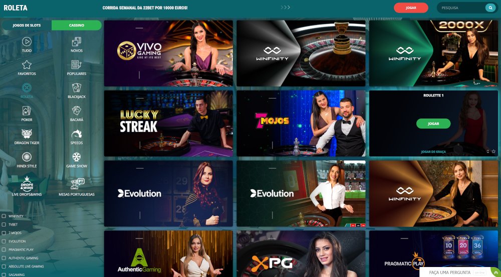 Um bom cassino ao vivo é obrigatório para todo operador sério de jogos, a 22Bet entende isso. Eles têm acordos com alguns dos mais importantes fornecedores de software de cassino ao vivo, como Evolution Gaming, Pragmatic Play, Winfinity e Playtech, e também com muitos outros menores, como Fazi, XPG, Swintt, Ezugi, Authentic Gaming, TVbet e muito mais.