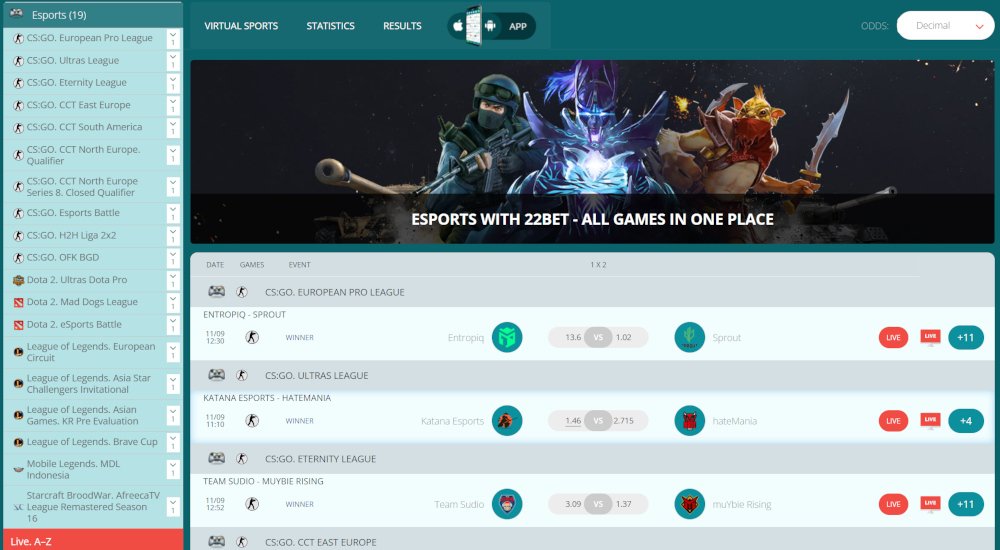 Nos esportes eletrônicos, as odds que a 22bet oferece são altamente equilibradas quando comparadas com outras casas importantes do mercado.