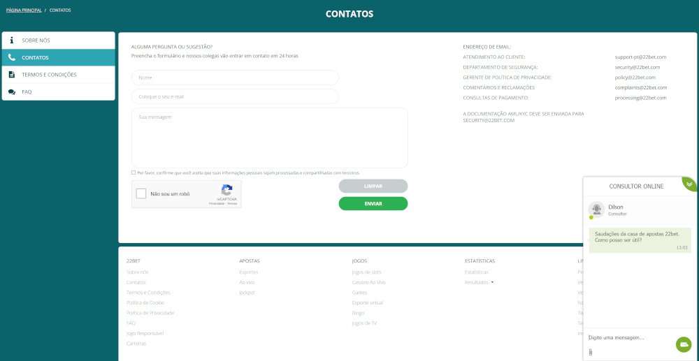 O canal de suporte ao cliente oferecido pela 22bet é bem eficiente e ágil, o que torna um ponto importante para o apostador, não é mesmo?
