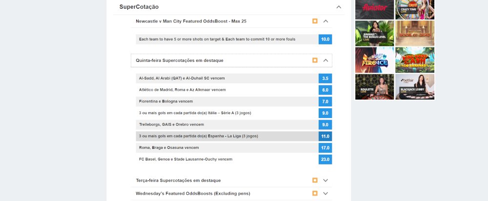 Na Betfair, o incentivo de cotações elevadas é denominado SuperCotações e surge para o apostador na seção de promoções à disposição.