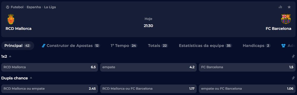 Exemplo de odds decimais no jogo de futebol RCD Mallorca x FC Barcelona na La Liga.