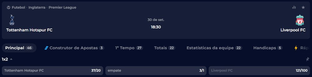 Exemplo de odds fracionais no jogo de futebol Tottenham Hotspur x Liverpool FC na Premier League.
