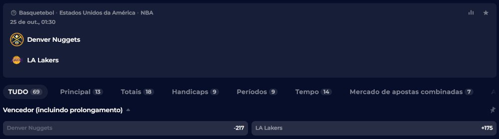 Vamos considerar uma partida da NBA entre o Denver Nuggets e o LA Lakers. Neste cenário, o Denver Nuggets tem odds de -217, enquanto o LA Lakers está com +175.