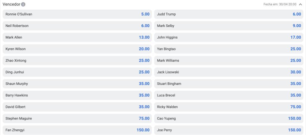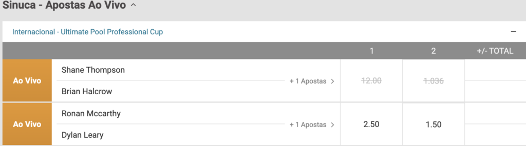 Nos casos em que as ODDs são bem semelhantes entre os dois competidores, isso quer dizer que ambos têm grandes chances de ganhar a partida de sinuca.