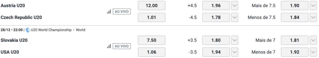 Na Bet365, por exemplo, você pode seguir por essa aposta no jogo de Hóquei no Gelo. São dois times, assim como futebol, e ganha aquele que fizer mais pontos em determinado intervalo de tempo.